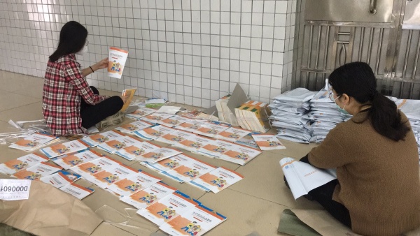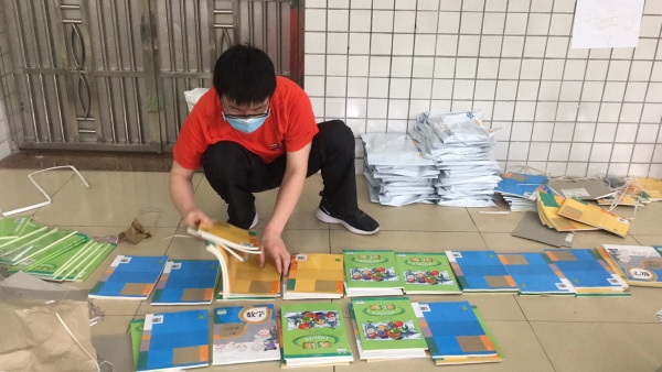 在這特殊時期,為了讓孩子們有書可讀,又避免聚集的風(fēng)險。該校后勤部門確定使用“零接觸”的郵寄方式把新學(xué)期的課本送到每一位學(xué)生手中。迅速組織班主任做好每一位學(xué)生的信息登記、統(tǒng)計,反復(fù)核對確保信息無誤。信息收集完畢后,幾位教師主動承擔(dān)到校協(xié)助郵政人員按年級、班級、人員對書本進(jìn)行打包處理的任務(wù),以最快的速度確保學(xué)生的學(xué)習(xí)用書的到位。