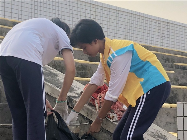 開發(fā)區(qū)一中志愿者服務(wù)隊(duì)的同學(xué)們利用周末的時(shí)間,在胡筱鴻副校長的帶領(lǐng)下,與健康花城社區(qū)的工作人員一起進(jìn)行了衛(wèi)生清理工作。黨員教師黃輝梅則帶著學(xué)生志愿者,從開發(fā)區(qū)一中北門出發(fā),撿拾學(xué)?;@球場、塑膠跑道、足球場及看臺(tái)上的垃圾。教師黨員志愿者們則兵分兩路,分別從正、西門出發(fā),沿著學(xué)校圍墻外側(cè)人行道,清理沿途墻角和綠化帶里的碎紙、膠袋、包裝盒、舊瓶子等雜物。他們不放過一處死角,清理掉沿途的垃圾。路過的群眾、鍛煉身體的人們、社區(qū)的業(yè)主紛紛為他們的行動(dòng)點(diǎn)贊。
