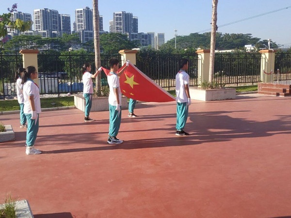 會操表演在雄壯的國歌聲下拉開了帷幕,升旗儀式后同學(xué)們舉起右拳莊嚴(yán)宣誓: