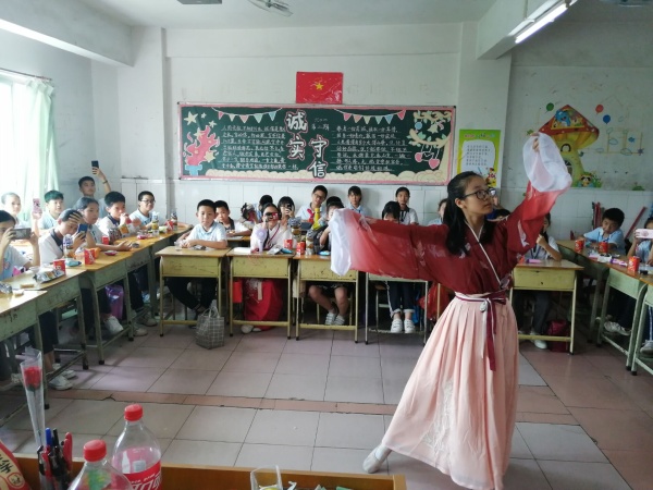活動中,各班學生早早將教室桌椅擺放好,分小組坐好,并拿出自己精心準備的各種美食,與老師,同學們分享。同學們一邊品嘗著美食一邊觀看表演。有的班級以傳統(tǒng)活動為主,如:猜謎語、搶板凳、撕名牌等游戲穿插到節(jié)目中,教室里充滿了學生的歡歌笑語。有的班級以“歌唱祖國、獻詩給祖國”為主題,展示著各自的才藝,有合唱,詩朗誦、舞蹈等節(jié)目,臉上洋溢著幸福的微笑。有的班級活動內(nèi)容形式多樣,如:擊鼓傳花、歌曲串燒、氣球運輸?shù)裙?jié)目。表達著心中的喜悅之情。同學們通過不同的節(jié)目形式,展現(xiàn)了當代少年兒童熱愛祖國,朝氣蓬勃、昂揚向上的精神風貌。