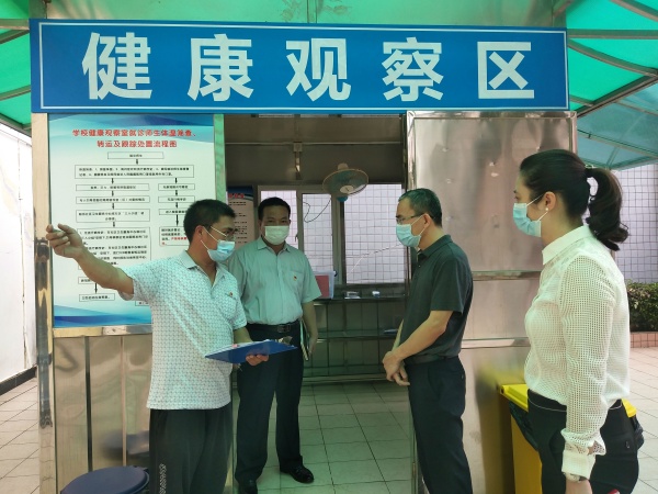 5月9日上午,民眾鎮(zhèn)黨委副書記、鎮(zhèn)長黃聲群、黨委委員劉釗妍、衛(wèi)健局、市場監(jiān)管局、社區(qū)衛(wèi)生服務中心、疾控中心及教育事務指導中心黃海文主任、田萊莉副主任等組成學生返校疫情防控專班來到民眾中心小學,對學生返校疫情防控準備工作進行驗收。在民眾中心小學全體行政陪同下,黃聲群鎮(zhèn)長一行分成兩組,分別對民眾中心小學的疫情防控工作進行了實地考察和防疫準備工作資料查閱,了解學校各項防疫工作是否按照中山市學生返校專班62項要求落實學生返校復學準備工作。之后,專班成員針對各項要求對本次驗收工作進行反饋,并提出相關的整改建議,要求學校盡快落實整改,并做好相關的資料上報。