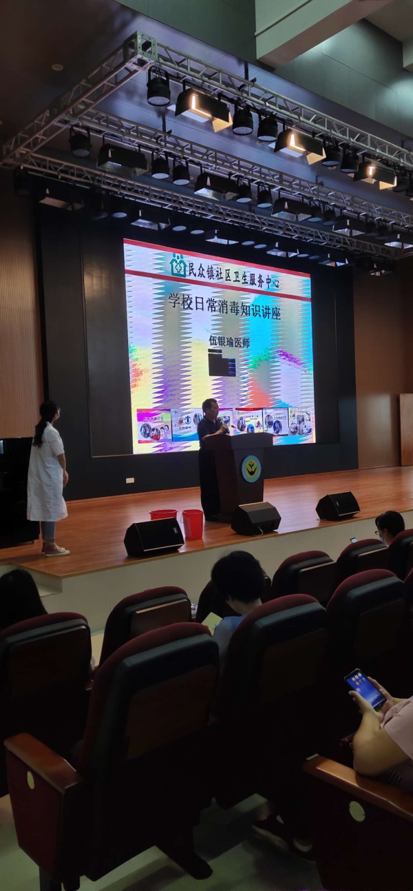 接著,鎮(zhèn)疾控中心伍醫(yī)師講解了學(xué)校常用的消毒措施與方法。她介紹了化學(xué)消毒法和物理消毒法。化學(xué)消毒法是當(dāng)前傳染病預(yù)防控制的主要方法,根據(jù)消毒劑對(duì)微生物的殺滅種類和效果,她深入淺出介紹了高效消毒劑、中效消毒劑和低效消毒劑的使用方法和注意事項(xiàng)。教職工從中系統(tǒng)地學(xué)習(xí)了化學(xué)消毒法。在講解物理消毒法時(shí),她講授了擦拭法和表面噴灑法。擦拭法的技術(shù)要點(diǎn)是均勻不遺漏,擦拭后作清潔處理;表面噴灑法用噴霧器直接噴灑消毒液,均勻不遺漏地噴灑,噴濕而不流水。伍醫(yī)師的講解,贏得大家的贊嘆。