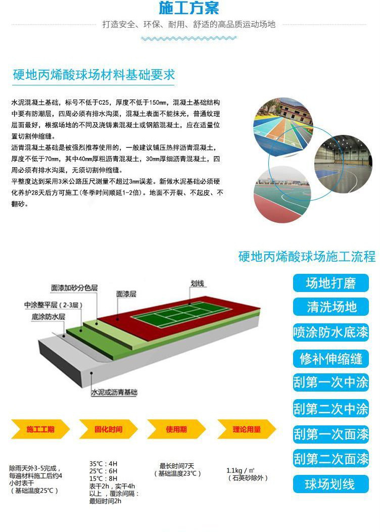 適用范圍:網(wǎng)球場、籃球場、羽毛球場、排球場、室內(nèi)外地坪,走廊樓梯,景觀道路,游樂場地面。