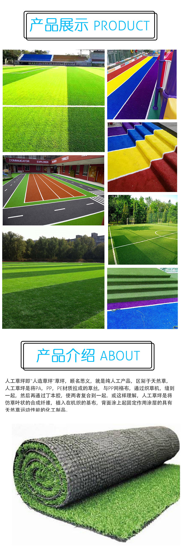 人工草坪即“人造草坪”草坪,顧名思義,就是純?nèi)斯ぎa(chǎn)品,區(qū)別于天然草,人工草坪是將PA,PP,PE材質(zhì)拉成的草絲,與PP網(wǎng)格布,通過(guò)織草機(jī),縫到一起,然后再通過(guò)丁本膠,使兩者復(fù)合到一起?;蜻@樣理解,人工草坪是將仿草葉狀的合成纖維,植入在機(jī)織的基布,背面涂上起固定作用涂層的具有天然草運(yùn)動(dòng)性能的化工制品。