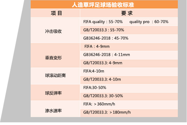 (1)出于安全考慮,2001年國際足聯(lián)頒布了人造草足球場地驗收標(biāo)準(zhǔn),規(guī)定沖擊吸收需達(dá)到55-70% ,比國際田聯(lián)規(guī)定的塑膠跑道沖擊吸收35-50%要高出20%,2006年,國家質(zhì)監(jiān)總局與國家標(biāo)準(zhǔn)化管理委員會發(fā)布了GB/T 20033.3國家標(biāo)準(zhǔn),規(guī)定沖擊吸收為55-70%。