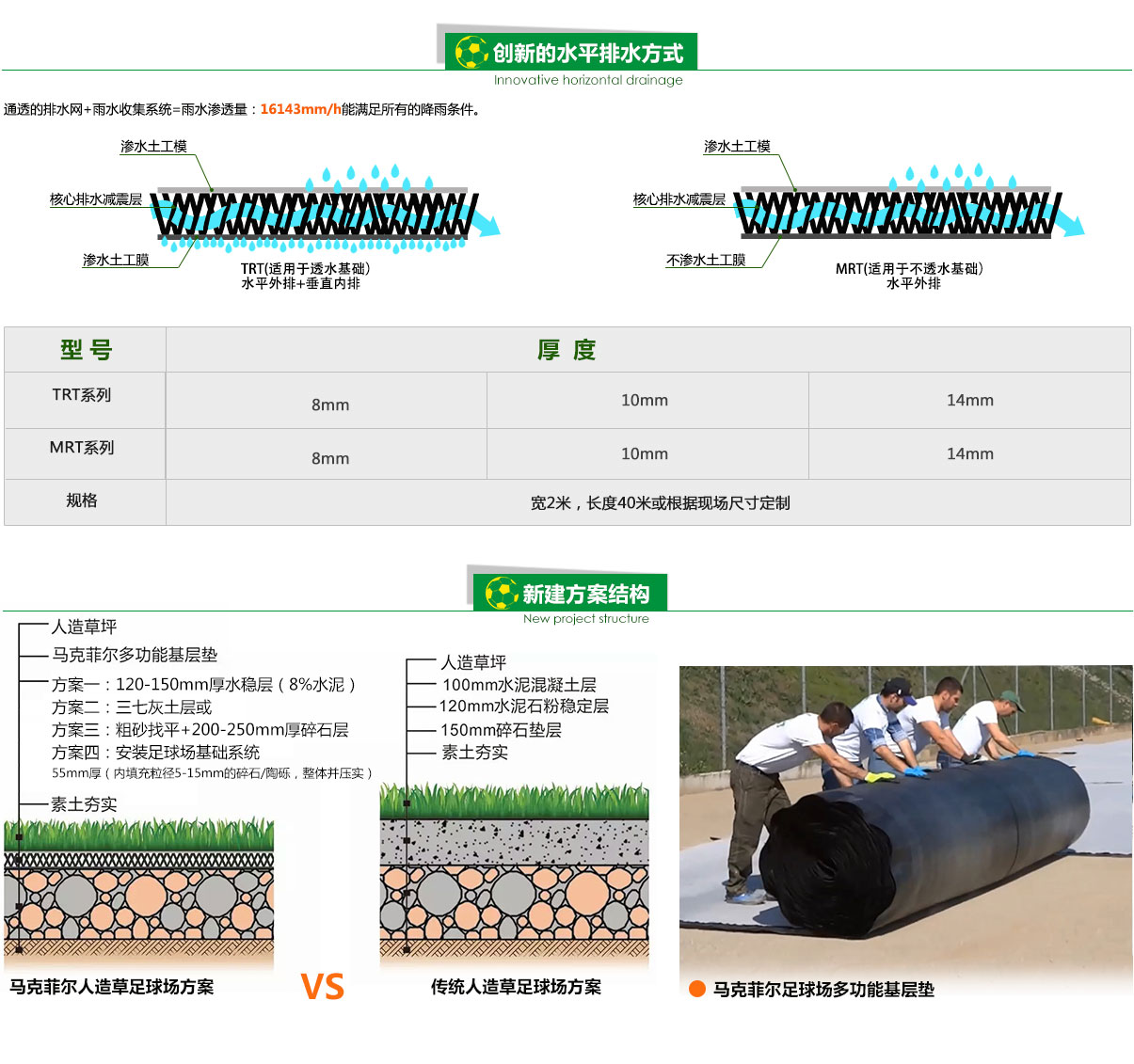 傳統(tǒng)人造草足球場,直接將人造草鋪設(shè)于水泥混凝土上,僅靠石英砂和填充顆粒進(jìn)行緩沖,且沒有排水空間,震動吸收和基層滲透都難以達(dá)到標(biāo)準(zhǔn)。