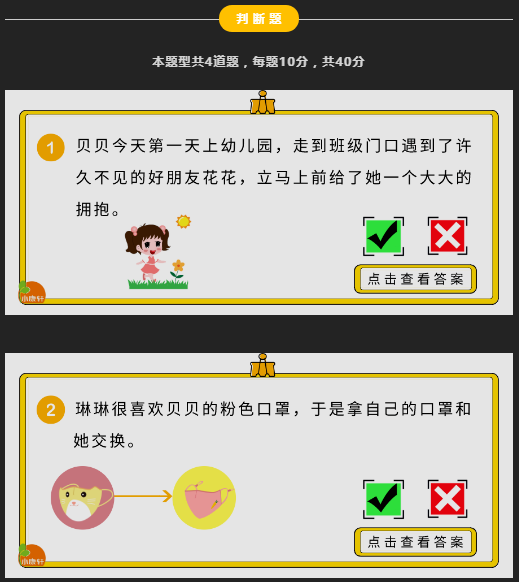 那么,你們的幼兒園開學(xué)了嗎?你們班的孩子安全系數(shù)又是多少?這份幼兒園致所有小朋友們疫情防護測試題,幼師們快發(fā)到家長群,請家長監(jiān)督完成,看看你們班的孩子適不適合開學(xué)呢?
