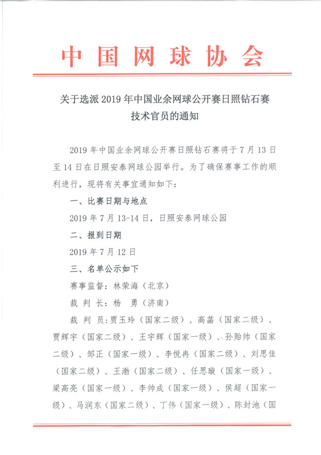 關(guān)于選派2019年中國業(yè)余網(wǎng)球公開賽日照鉆石賽技術(shù)官員的通知