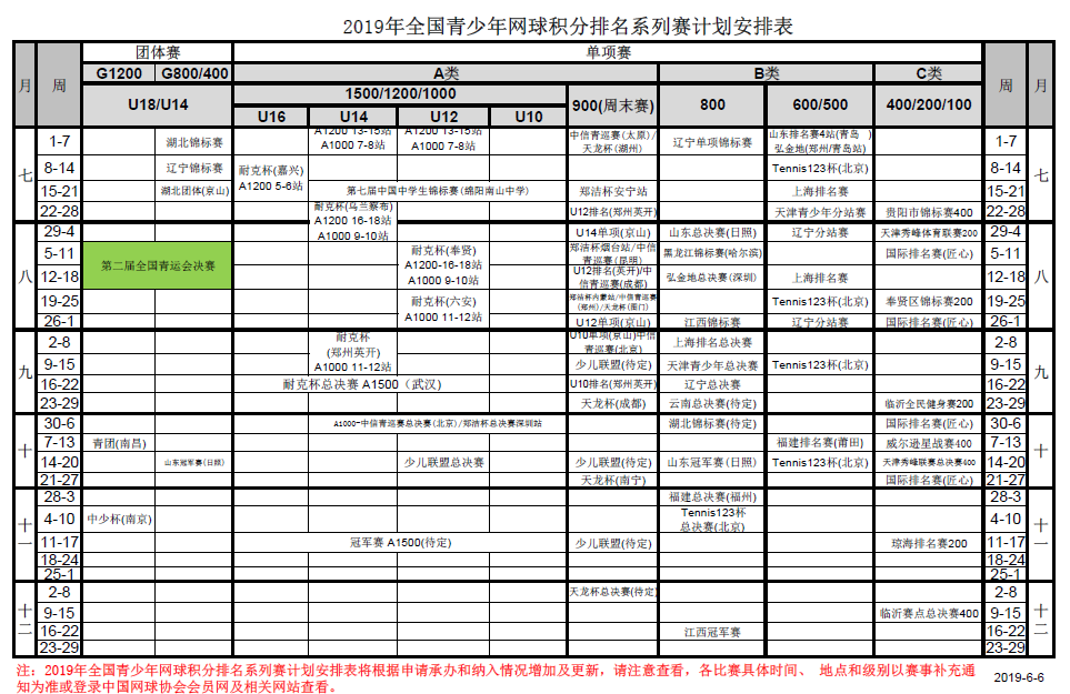 2019年全國青少年網(wǎng)球積分排名系列賽競賽計劃安排表