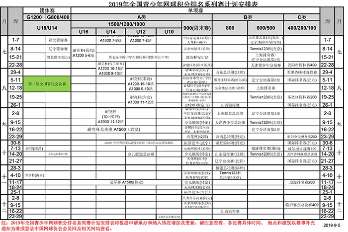 2019年全國青少年網(wǎng)球積分排名系列賽競賽計(jì)劃安排表(2019-9-18)