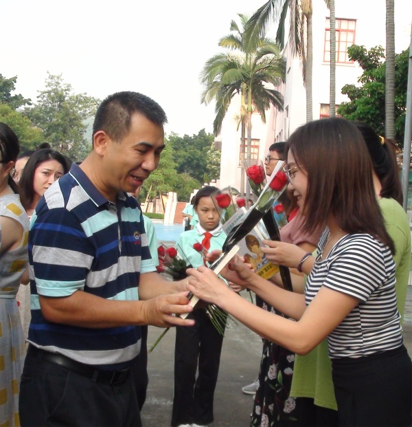 9月9日早上8點,全校師生集聚在大操場上,注視著冉冉升起的五星紅旗,高唱《國歌》。接著,兩位少先隊員分別在東西校區(qū)國旗下滿懷深情地進行國旗下講話,并代表全體學生為教師們送上真摯的祝福。緊接著,廣播員邀請所有的老師來到前臺,李向平校長、羅少光副校長和李衍裕副校長分別為東西兩個校區(qū)的老師們送上書本和鮮花,據(jù)悉這是每一年竹小的教師節(jié)最特別的禮物,為每一位老師送上一本老師最愛的書,全校洋溢著陣陣感動和溫情。在洋溢著感恩的氣氛中,李向平校長向全體教職工送上了節(jié)日的祝福,他對一直以來為了學校的發(fā)展和學生健康成長辛勤付出的老師們給予了充分的肯定與高度的贊揚。