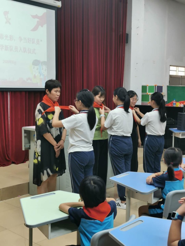 6月3日下午,隨著音樂響起,主會(huì)場(chǎng)一年級(jí)小同學(xué)攜手踏入多媒體教室時(shí),他們的臉上綻放著甜蜜的笑容。隨后由六年級(jí)的大哥哥大姐姐為他們授、掛紅領(lǐng)巾。 一年級(jí)新隊(duì)員激動(dòng)而稚氣的臉龐,讓全場(chǎng)都熱烈鼓掌。隨后,大隊(duì)輔導(dǎo)員為各班授中隊(duì)旗。