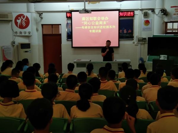 為提高學(xué)生的安全意識和自我防護(hù)意識,營造安全和諧的校園環(huán)境,近日,中山市良都中學(xué)邀請南區(qū)知聯(lián)會一同舉辦“同心公益周末”電梯安全知識進(jìn)校園系列專題講座。