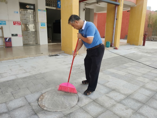 行動(dòng)中,烈日當(dāng)空,炙烤著大地,教師們面對(duì)校園景觀改造工地地面塵土堆積,碎石隨處可見,生活垃圾隱匿角落的景象沒有就此退縮,反而熱情高漲,手拿大掃帚,扛著大鐵鏟,推著斗車,興致勃勃地投入到清潔行動(dòng)中。為了把塵土堆積的地面進(jìn)行徹底地清潔,有的教師拿著水管來沖刷,有的教師拿著拖把來清理;為了把隱匿在空調(diào)主機(jī)背后的生活垃圾,盧新泉校長(zhǎng)用未戴手套的雙手清理垃圾,在盧校長(zhǎng)的率先垂范下,幾位初一級(jí)老師紛紛用手把垃圾清理干凈,充分發(fā)揮了不怕累、不怕臟的精神;他們?nèi)绱苏J(rèn)真地清潔,如此勤懇地付出,是因?yàn)榘褜W(xué)校當(dāng)做家呀!即便是揮汗如雨,依舊義無反顧,教師們的行動(dòng)保證了校園各個(gè)角落干凈整潔。