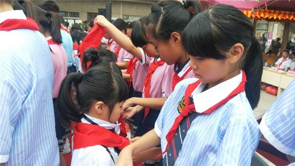 致辭完畢,進(jìn)行第一個環(huán)節(jié)——新隊員入隊儀式。先是全體肅立,奏唱國歌,后出隊旗,唱隊歌。隨后由少先隊輔導(dǎo)員梁毅強(qiáng)老師宣讀新隊員名單,并由四、六年中隊隊員為新隊員佩戴紅領(lǐng)巾,最后新隊員在輔導(dǎo)員梁老師的帶領(lǐng)下作隊旗下的宣誓。