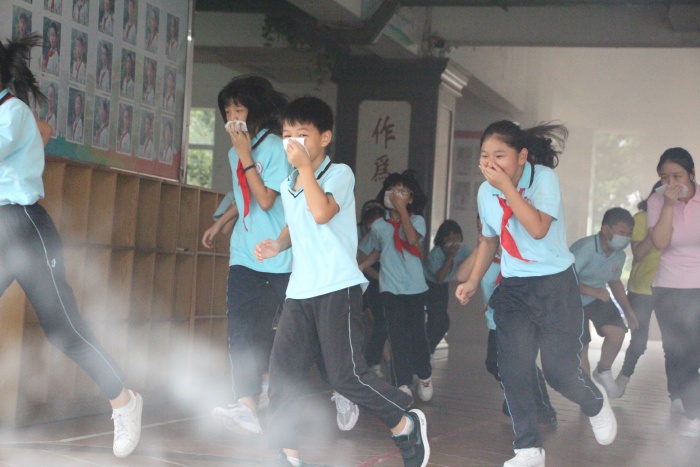 8時(shí)50分,各樓層突然濃煙四起,警報(bào)聲響徹校園,各位老師按照預(yù)案的要求各就各位,所有學(xué)生在老師的組織下,迅速把毛巾或紙巾打濕,按照平時(shí)指定的路線彎腰前進(jìn),有序疏散到了安全的地點(diǎn)。