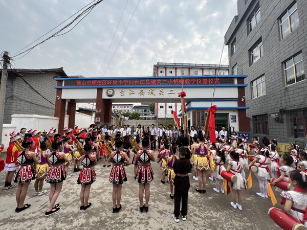 4月21日上午,城關二小的老師和同學們?yōu)辇埻飧叫〉睦蠋焸兣e行了隆重的歡迎儀式,孩子們精神抖擻,奏響了熱情的苗家歌曲,并為客人獻上了花帶。隨后,在城關二小李鎮(zhèn)校長的組織下,龍外附小的老師們參與了學校的體育用品捐贈儀式暨新建大門落成啟用儀式。捐贈儀式上,龍外附小的周燕校長代表學校向城關二小捐贈了價值4000多元的體育用品。