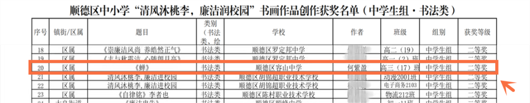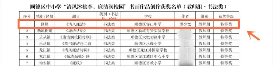 近日,順德區(qū)教育局公布了“清風(fēng)沐桃李,廉潔潤校園”師生書畫作品創(chuàng)作活動獲獎名單,我校教師譚少寬的書法作品《清風(fēng)廉潔》喜獲特等獎。另外,學(xué)生何紫盈的書法作品《蟬》也獲得了本次活動的二等獎。 獲獎名單