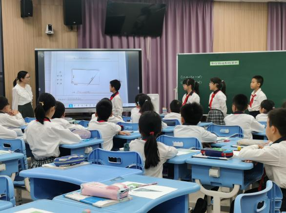 首先,由龍江城區(qū)中心小學程佩樺老師帶來五年級上冊《平行四邊形的面積》一課。程老師結合可視化教學的理念,引入與應用可視化技術為學生構造學習環(huán)境,及時喚起學生的學習興趣與動力,讓他們易于完成知識建構與能力轉化。本節(jié)課利用魚骨圖分析《平行四邊形的面積》的三維目標,為開展可視化教學設計提供基礎。“知識與技能”維度體現(xiàn)在可視化教學技術支持下,通過探究并推理出平行四邊形的面積公式,能正確地應用公式計算平行四邊形的面積?!斑^程與方法”維度體現(xiàn)在可視化理念支持下,通過動手操作、仔細觀察、活動,自主探索平行四邊形面積計算公式,滲透轉化的數(shù)學思想方法。“情感態(tài)度與價值觀”體現(xiàn)在培養(yǎng)學生動手探究、應用遷移、合作交流的能力。