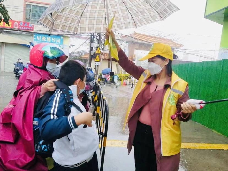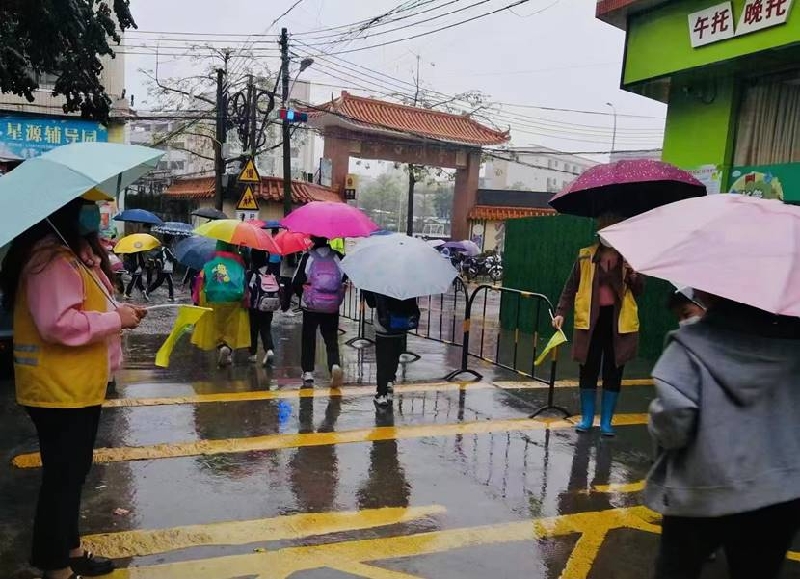 即使是這樣惡劣的天氣,我們的護暢隊依然每天早上7:15-7:40的上學(xué)時段,晚上5:45-6:20的放學(xué)時段早早到崗,統(tǒng)一穿上義工服,站在管轄區(qū)、校門口兩旁指引家長車輛排隊行駛,勸阻逆行或危險車輛,幫助學(xué)生上、下車并護送進、出校門。