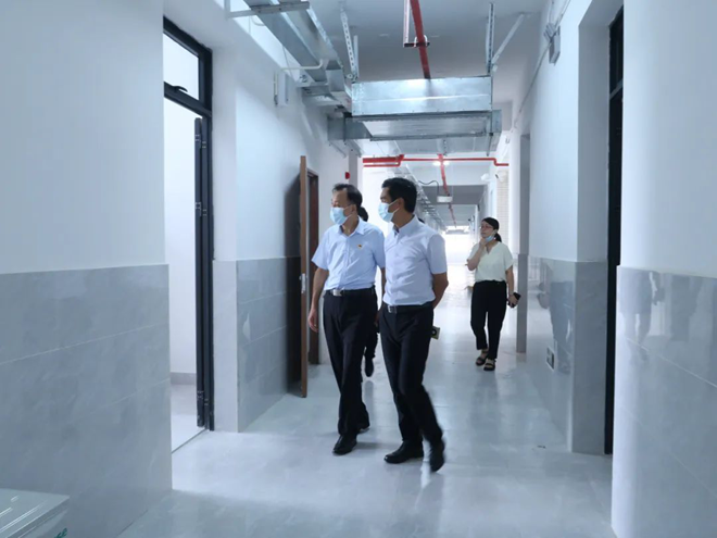 李廣慶一行查看了學(xué)校新宿舍樓、防疫物資儲備室、飯?zhí)靡约跋涝O(shè)施設(shè)備等,詳細了解師生返順、疫情防控、物資儲備、衛(wèi)生管理、食品安全等相關(guān)情況。