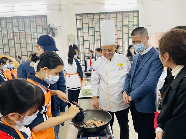 大廚嚴(yán)金明先生現(xiàn)場(chǎng)指導(dǎo)孩子們烹制注意事項(xiàng),家長(zhǎng)助手和孩子們都卯足干勁,刀、勺、鏟、叉統(tǒng)統(tǒng)上陣,油、鹽、醬、醋搭配得當(dāng),秀出了十八般廚藝,言傳與身教此刻顯現(xiàn)得淋漓盡致!