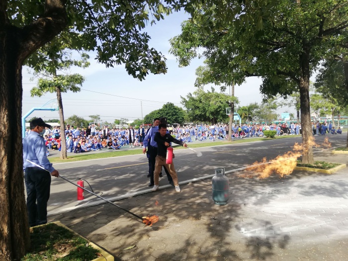 隨后,盧楚展詳細(xì)講解消防安全知識(shí),演示滅火器的正確使用方法。只見他手持滅火器,熟練地拔掉保險(xiǎn)栓,左手拿噴管,右手下壓把手,把大火撲滅。學(xué)校教師代表、保安、保安職工等在盧警官的指導(dǎo)下還模擬使用滅火器。