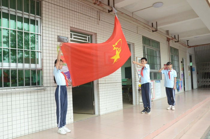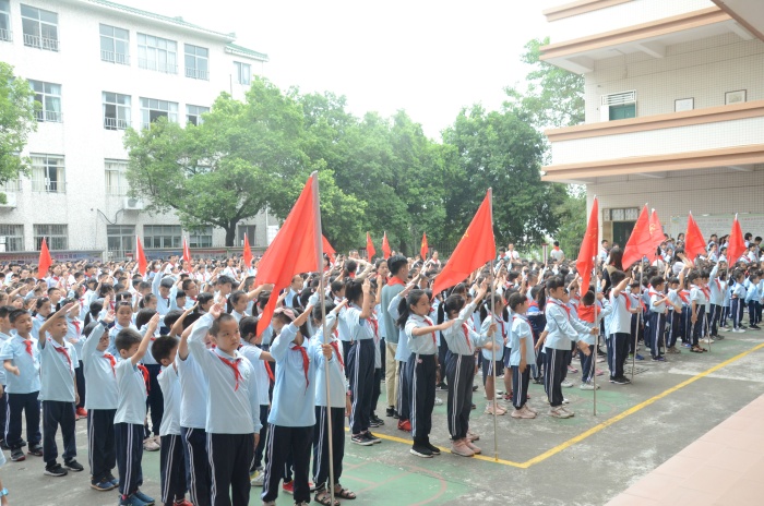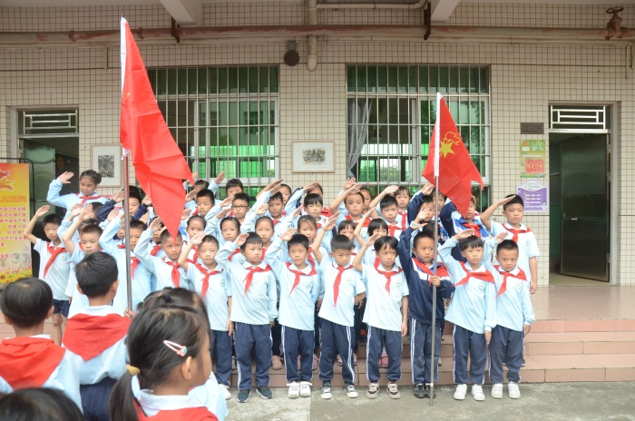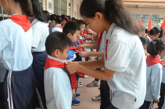 入隊儀式隨著《中國少年先鋒隊隊歌》的歌聲正式拉開序幕,少先隊輔導(dǎo)員王利勇老師宣布了入隊決定。通過分批入隊,本次又有130名新隊員光榮的加入了少先隊組織,這是他們光榮和幸福的時刻!決定宣布之后,六年級優(yōu)秀少先隊員代表為新少先隊隊員佩戴了鮮艷的紅領(lǐng)巾,此刻在鮮艷的隊旗下,全體少先隊員們的莊嚴(yán)宣誓響徹大涌南文小學(xué)校園的上空。在大隊輔導(dǎo)員的帶領(lǐng)下,少先隊員們大聲呼號:“時刻準(zhǔn)備著”,表明為共產(chǎn)主義事業(yè)貢獻力量的決心。