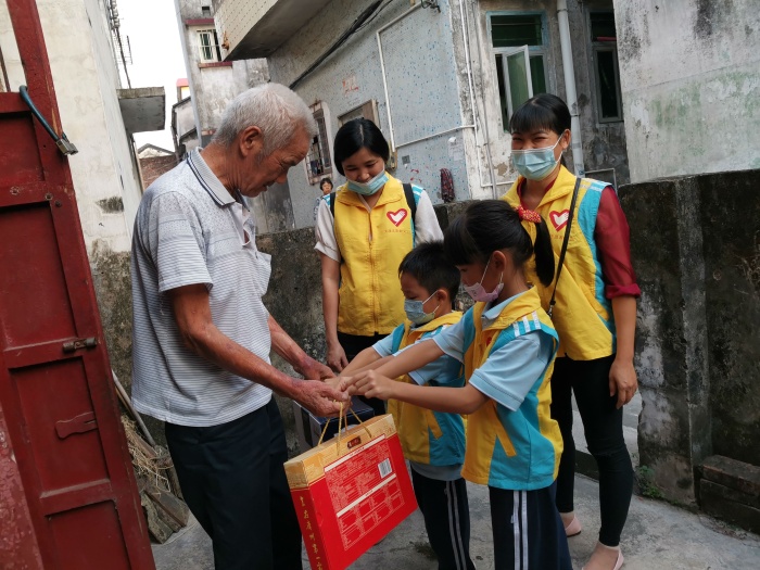 眾人拾柴火焰高。10月19日,安堂小學(xué)少先隊(duì)輔導(dǎo)員伍影梨老師發(fā)出倡議,開展了重陽募捐活動。所籌善款將全部送給安堂社區(qū)69名孤寡老人和高齡老人。10月27日,在安堂社區(qū)工作人員的協(xié)助下,安堂小學(xué)少先隊(duì)組織10隊(duì)親子義工代表,到家探訪8位老人,以表達(dá)全校師生、家長對老人的關(guān)愛。小朋友們爭著為老人送上慰問金以及慰問品,并送上最真摯的祝福。老人們拉著孩子們的手,樸實(shí)真切的笑容在臉上洋溢開來。