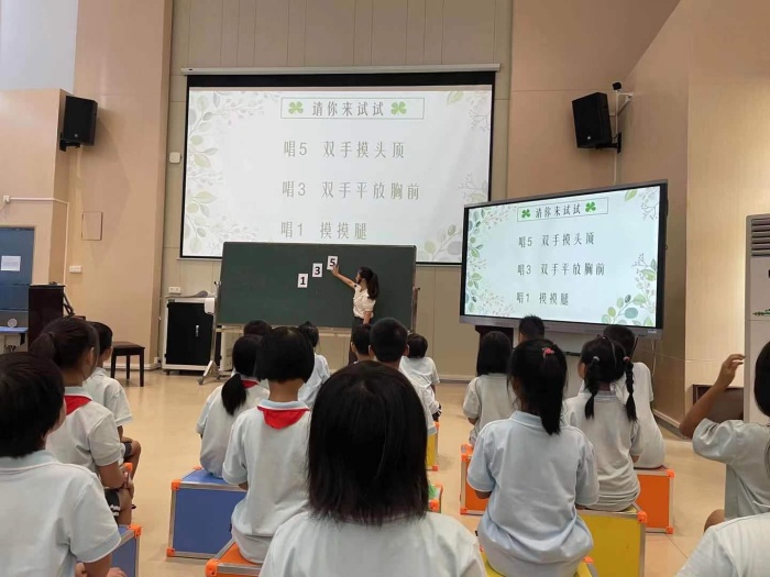 活動伊始,由陳靖甜老師帶來二年級上冊第2課《乃喲乃》。陳老師重點教授do mi sol的音準。她通過節(jié)奏練習、身勢活動讓學生熟悉do mi sol的音高音準,隨后用“師問生答”的方式引導學生運用do mi sol進行旋律創(chuàng)編,鞏固了學生對do mi soli三個音的掌握,各個環(huán)節(jié)環(huán)環(huán)相扣,層層深入,為大家?guī)砹艘还?jié)身勢與創(chuàng)編相結(jié)合的精彩課堂。