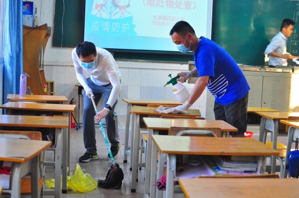 下午4點50分,模擬演練開始。上課期間,二甲班一名“學(xué)生”頭暈胸悶想嘔吐,報告上課老師。上課老師立即戴好口罩,提供嘔吐袋給學(xué)生并打電話報告領(lǐng)導(dǎo)小組成員。班長迅速疏散學(xué)生到戶外,領(lǐng)導(dǎo)小組成員接到通知,啟動應(yīng)急預(yù)案,組織應(yīng)急小組成員前來支援處置。衛(wèi)生保健組老師對全班學(xué)生進行體溫復(fù)測,引導(dǎo)嘔吐學(xué)生到隔離點觀察,消毒組老師立即使用專用消毒桶、掃把、抹布等,配置消毒液,對現(xiàn)場進行消毒,并對嘔吐物進行殺菌消毒。演練過程迅速、有序,分工明確,在最短時間內(nèi)完成突發(fā)事件應(yīng)對與處理。