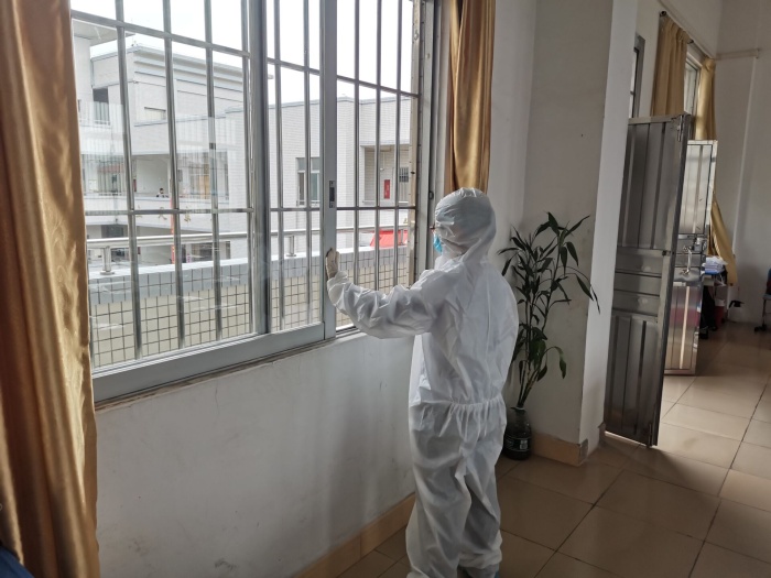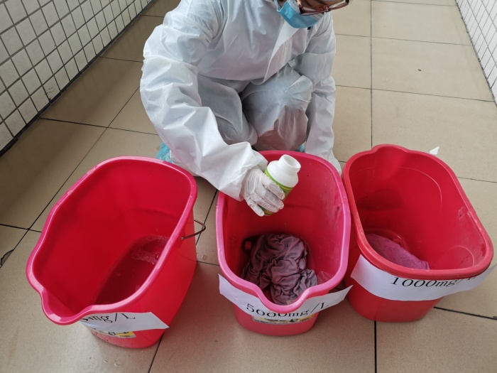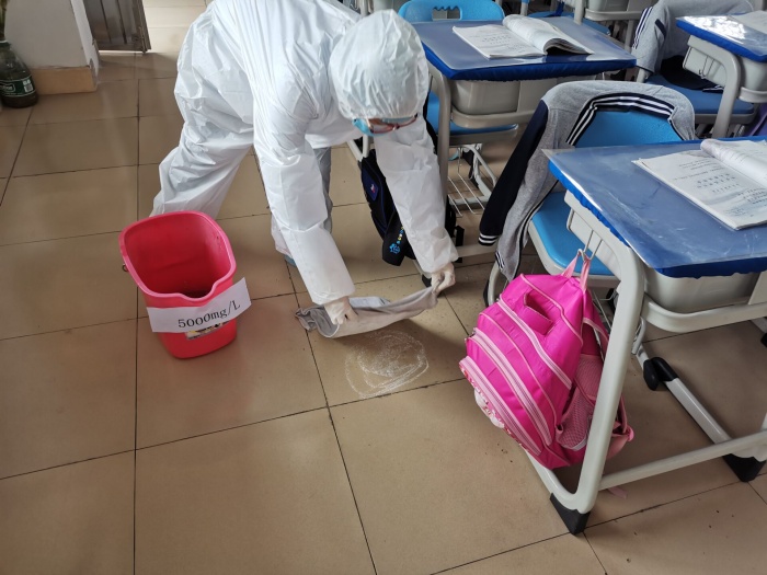 本次演練以如何處置嘔吐物為主,班主任和學(xué)生代表、吳醫(yī)生在譚主任的組織下,有序地進(jìn)行個(gè)人防護(hù)用品的穿戴,包括佩戴口罩、穿好隔離衣、戴好一次性手套和帽子等,隨后將清潔吸附巾覆蓋在嘔吐物等污物上,接著將污濁吸附巾放入原包裝袋密封丟入廢物袋中,再取出濕巾由干凈區(qū)到污濁區(qū)從外至里螺旋式擦拭,至中心區(qū)域后收緊濕巾丟入廢物袋,消毒完成后,依次脫去防護(hù)用具。