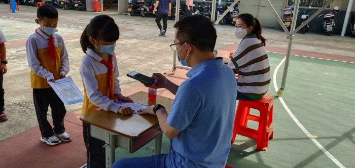 學(xué)校核酸檢測按照全鎮(zhèn)的統(tǒng)一部署,上午8點(diǎn)準(zhǔn)時(shí)開始,高強(qiáng)輝校長一直在現(xiàn)場指揮工作,陳名勝、劉俊霞、謝慶生等黨員教師在一線參與。根據(jù)防疫要求,現(xiàn)場待采的每位師生均保持一米以上的防護(hù)距離,按照一至六年級(jí)的順序采取分批、分組的方式進(jìn)行錯(cuò)峰檢測,避免人員過多聚集。在學(xué)生進(jìn)行核酸采樣前,老師詳細(xì)核實(shí)學(xué)生信息,分組排隊(duì)進(jìn)入等候區(qū)。學(xué)生進(jìn)入采樣區(qū)后,醫(yī)生再次核對(duì)信息,確定無誤后進(jìn)行采樣。學(xué)生檢測完畢,立即按老師的指引從指定路線回到班級(jí)。整個(gè)過程有條不紊。