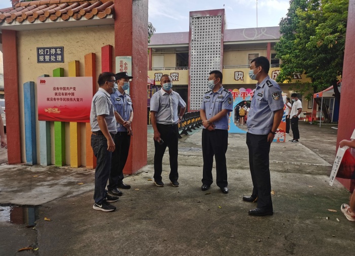 為扎實(shí)推進(jìn)新學(xué)期校園防疫、安保工作部署,促進(jìn)其安全穩(wěn)健發(fā)展,2021年9月1日上午,東鳳鎮(zhèn)人大代表團(tuán)和東鳳公安分局局長(zhǎng)楊建軍、副局長(zhǎng)劉丹軍、治安大隊(duì)長(zhǎng)李斐明分別到小瀝小學(xué),督查學(xué)校疫情防控和校園安保工作的開(kāi)展情況,林偉光校長(zhǎng)及學(xué)校行政陪同。