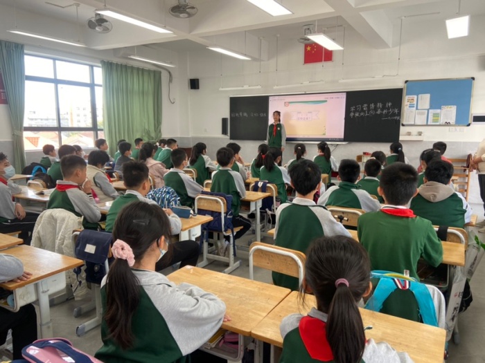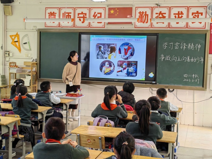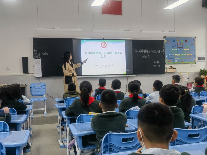 升旗儀式上,五9中隊的隊員做以“學(xué)雷鋒”為主題的國旗下演講。他在演講中回顧雷鋒的感人事跡,號召隊員們向雷鋒學(xué)習(xí),團結(jié)友愛,樂于奉獻,從現(xiàn)在做起,從小事做起,為建設(shè)美好社會貢獻自己的力量。接著各中隊開展“軒小少年說”的活動,說得是雷鋒故事,學(xué)得是新時代雷鋒精神。隊員繪聲繪色地講述著一個個生動的紅色故事。主題隊會課伊始,輔導(dǎo)員們通過講述“雷鋒是誰”讓隊員對雷鋒有了全面的了解,知道雷鋒曾是飽受苦難的苦孩子、熱愛勞動的奉獻者、熱愛學(xué)習(xí)的求知者、刻苦鉆研的“螺絲釘”、助人為樂的志愿者。緊接著,輔導(dǎo)員結(jié)合PPT及富有感染力的視頻,向隊員們展示現(xiàn)實生活中的“活雷鋒”事跡,帶領(lǐng)隊員領(lǐng)悟愛國奉獻、助人為樂、勤儉節(jié)約、艱苦奮斗等雷鋒精神,引導(dǎo)隊員在生活中盡己所能、熱心助人;努力學(xué)習(xí),認(rèn)真做事。尾聲,隊員們齊唱《學(xué)習(xí)雷鋒好榜樣》,他們用嘹亮的歌聲致敬身邊的活雷鋒,激勵自己爭當(dāng)活雷鋒,做新時代雷鋒精神的傳承人。