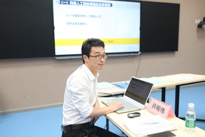 會(huì)議第一項(xiàng),課題主持人許明偉老師做課題研究結(jié)題報(bào)告匯報(bào)。他分別從研究背景、研究實(shí)施、研究成效、研究思考還有研究收獲七個(gè)方面,對(duì)課題的研究過(guò)程和研究結(jié)果,進(jìn)行了詳盡的總結(jié)匯報(bào)。匯報(bào)中,許老師緊緊圍繞課題的研究目標(biāo),圍繞研究?jī)?nèi)容,沿著課程開(kāi)發(fā)的過(guò)程展開(kāi)深入研究。課題組梳理了人工智能教育的現(xiàn)狀與不足,構(gòu)建了新形勢(shì)的“1+2”的人工智能教育課程體系,并開(kāi)發(fā)設(shè)計(jì)了校本化的人工智能學(xué)生項(xiàng)目手冊(cè);課題組積極開(kāi)展體驗(yàn)課程、思維課程與實(shí)踐課程的教學(xué)實(shí)踐,基于學(xué)生的認(rèn)知水平,對(duì)應(yīng)以體驗(yàn)式教學(xué)、基于問(wèn)題解決和項(xiàng)目學(xué)習(xí)的教學(xué)策略展開(kāi)教學(xué),并提煉出課程實(shí)施的教學(xué)模式,形成了可操作、可推廣的經(jīng)驗(yàn)。課題組還將課程開(kāi)發(fā)與實(shí)踐的經(jīng)驗(yàn)撰寫(xiě)成四篇論文,分別發(fā)表在《教育信息技術(shù)》,《中國(guó)信息技術(shù)教育》和《中小學(xué)信息技術(shù)教育》等信息技術(shù)教學(xué)權(quán)威雜志上。