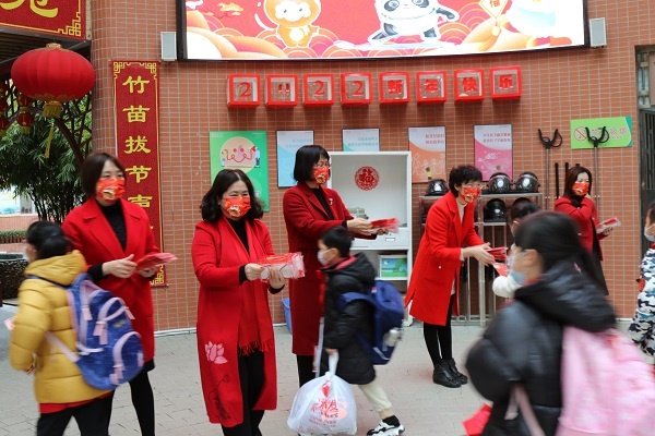 更欣春意早,處處有歡笑。在熟悉的校門口,如意吉祥的瑞虎和同學(xué)們熱情互動(dòng),擊掌祝福,范柳娟校長(zhǎng)帶領(lǐng)全體行政在門口送給每位孩子一個(gè)“瑞虎臨門”的紅色口罩。一聲聲新年好,道出了孩子們對(duì)新年的祝愿,一張張笑臉,展現(xiàn)出孩子們對(duì)新學(xué)期的憧憬。伴隨著嘹亮的國(guó)歌聲,五星紅旗冉冉升起,拉開了開學(xué)典禮的序幕。范校長(zhǎng)為全體師生帶來(lái)思政第一課,并帶領(lǐng)全體行政和級(jí)組長(zhǎng)向全校師生致以新春祝福。