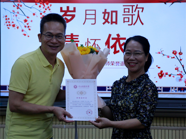 然后,謝柏芳校長代表學(xué)校向楊金娥老師頒發(fā)了榮譽退休證書,對楊老師在東區(qū)中學(xué)取得的成績給予了充分肯定,對楊老師為學(xué)校作出的貢獻(xiàn)表示衷心感謝,并祝愿楊老師退休生活更精彩。