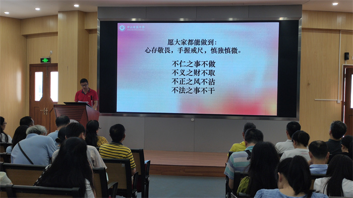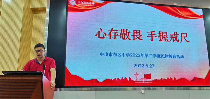 為持續(xù)加強學校黨風廉政建設,筑牢廣大黨員干部和教職工拒腐防變的思想道德防線,6月27日下午,中山市東區(qū)中學舉行主題為“心存敬畏 手握戒尺”的2022年第二季度紀律教育學習月活動?;顒佑尚|h總支委員楊群同志主持,全體教職工參與學習。