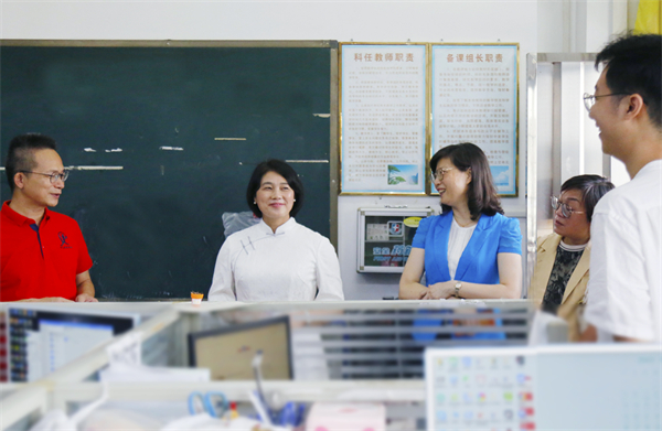 隨后,馮金怡副主席一行走進(jìn)教師辦公室,看望慰問正在備課的一線教師們?!白@蠋焸兘處煿?jié)、中秋節(jié)快樂,感謝你們對教育事業(yè)的付出和貢獻(xiàn)!”看到一個(gè)個(gè)充滿青春朝氣的老師,馮副主席坦言自己一下子回到了當(dāng)年從教的時(shí)光,雖然工作有變動(dòng),但自己對教育始終念念不忘,始終關(guān)注教育,傾情教育,雖然自己不在教育崗位上,但在工作中愈發(fā)感受到教育的重要、教師的偉大。走訪中,市、局領(lǐng)導(dǎo)與教師們親切交談,聆聽教師心聲,送上市委、市政府的關(guān)懷與問候。