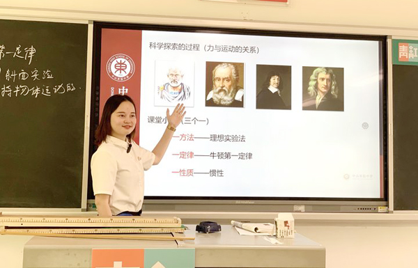 曾老師本次參賽課題為《牛頓第一定律》。課堂上,曾老師先以一個(gè)神奇的小魔術(shù)“橘子爬桿”導(dǎo)入新課,激發(fā)學(xué)生的學(xué)習(xí)興趣;緊接著通過兩個(gè)演示實(shí)驗(yàn)引導(dǎo)學(xué)生觀察,啟發(fā)學(xué)生思考“力與運(yùn)動(dòng)”的關(guān)系。其次,曾老師引入了歷史上物理學(xué)家們對(duì)“力與運(yùn)動(dòng)”的研究歷程,得出牛頓第一定律,加深了學(xué)生對(duì)“力與運(yùn)動(dòng)”這一重點(diǎn)知識(shí)的理解。最后,曾老師應(yīng)用幾個(gè)視頻展示,幫助學(xué)生理解“慣性的利用及防止”這一難點(diǎn)知識(shí)。課后專家評(píng)委對(duì)該節(jié)課進(jìn)行了詳細(xì)到位的評(píng)價(jià),肯定了曾老師流暢的教學(xué)設(shè)計(jì)和良好的課堂氛圍,提示教師注意引導(dǎo)學(xué)生總結(jié)概念和鞏固練習(xí)。