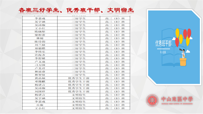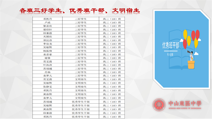 第三,針對本學(xué)期表現(xiàn)優(yōu)秀的學(xué)生進(jìn)行表彰,黃主任對獲獎(jiǎng)同學(xué)提出表揚(yáng),并且號召其他同學(xué)向優(yōu)秀的同學(xué)學(xué)習(xí)。