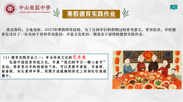 第四,對于寒假作業(yè)進(jìn)行布置,要主動(dòng)、自覺、自律的安排好每天的計(jì)劃表,有效率、有效果的完成各科作業(yè)。為了讓寒假過得更有意義,更有收獲,學(xué)校德育處設(shè)計(jì)了一份有助于培養(yǎng)學(xué)生勞動(dòng)意識、豐富文化常識、增進(jìn)親子感情的德育實(shí)踐作業(yè),希望同學(xué)們度過一個(gè)充實(shí)而有意義的假期生活。