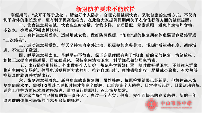 第二,黃天濤主任強(qiáng)調(diào)新冠防護(hù)要求不能放松,放開不等于放松,請各位同學(xué)做好個(gè)人防護(hù),合理安排健康飲食,保持健康的生活方式。希望大家做好自己健康的第一責(zé)任人,度過一個(gè)充實(shí)、健康、快樂的寒假,新的一年以強(qiáng)健的體魄開啟新征程。