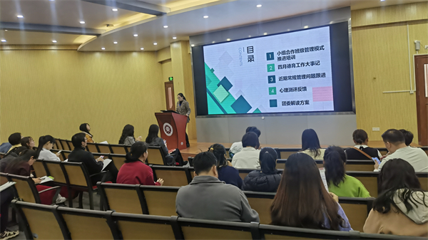 在本次的小組合作班級(jí)管理模式推進(jìn)培訓(xùn)會(huì)議中,梁可盈老師為全體班主任作題為《小組合作賦能班級(jí)管理》的班級(jí)管理經(jīng)驗(yàn)分享。梁老師以班級(jí)管理的痛點(diǎn)與期望為導(dǎo)入,分享了高一6班的班級(jí)管理運(yùn)轉(zhuǎn)模式。從小組合作制度的推行、班級(jí)構(gòu)造的完善、評(píng)分細(xì)則的敲定、反饋方式的多樣化等角度提出了班級(jí)管理的優(yōu)化建議。小組合作制度與德育考核評(píng)分制度的深度融合,提高了班主任的管理效率與有效性,調(diào)動(dòng)了學(xué)生參與班級(jí)管理的積極性,激發(fā)了內(nèi)部驅(qū)動(dòng)力;實(shí)現(xiàn)了與學(xué)生、與家長(zhǎng)的高效、有效溝通;能引導(dǎo)學(xué)生真正地實(shí)現(xiàn)“有則改之,無(wú)則加勉”,為班級(jí)管理減壓賦能。