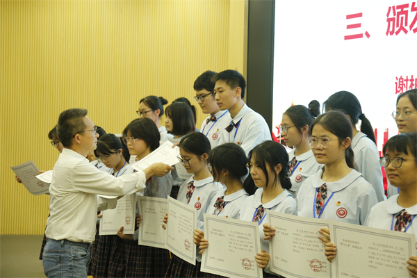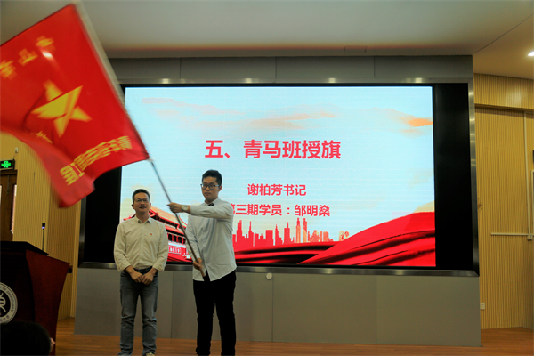 接著,謝柏芳書記為青馬班授旗。青馬紅旗在鄒明燊同學手中揮舞。這鮮紅的旗幟將會成為新一期青馬學員靚麗青春里一抹鮮亮的底色。隨后,林麗娜副校長分別為導師頒發(fā)聘書,德育處符曉主任為第三期青馬學員授牌。聘書和學員證的頒發(fā),意味著新一期青馬工程的正式開啟。希望青馬學員們能夠在優(yōu)秀黨員教師的身上學習黨史、學習科學理論知識,學習他們身上愛黨敬業(yè)的優(yōu)良品質(zhì)。