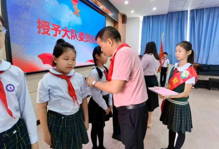 隨后,少工委主任何建明、副主任湯玨敏為新一屆學(xué)校大隊(duì)委員授予大隊(duì)委標(biāo)志?!罢?qǐng)黨放心,強(qiáng)國(guó)有我”慷慨激昂的誓言在校園回響,展現(xiàn)了少先隊(duì)員奮發(fā)向上、追求進(jìn)步的精神風(fēng)貌。他們將努力學(xué)習(xí),為實(shí)現(xiàn)中華民族偉大復(fù)興的中國(guó)夢(mèng)貢獻(xiàn)自己的力量!