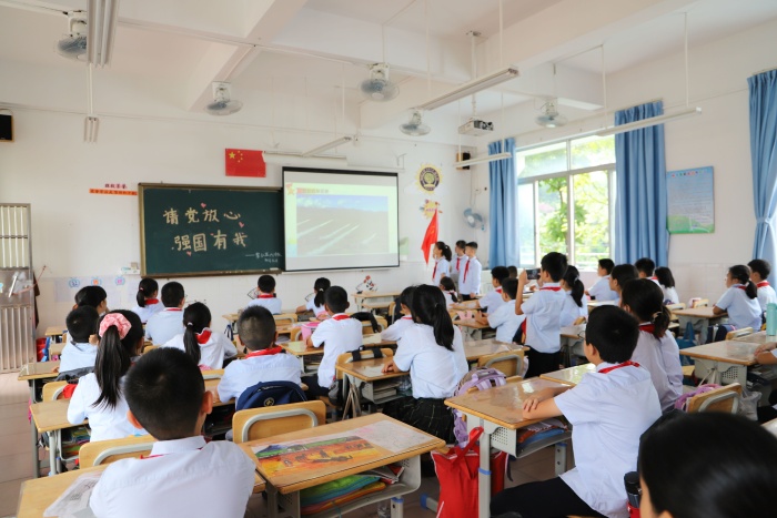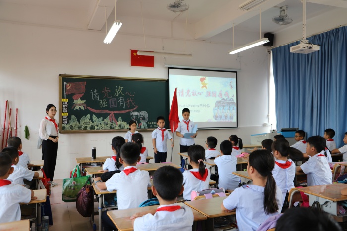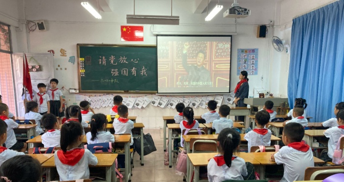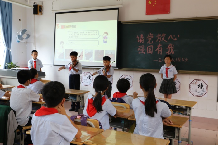 “請(qǐng)黨放心,強(qiáng)國(guó)有我”主題隊(duì)會(huì)。隊(duì)會(huì)課上,輔導(dǎo)員們從不同的視角,用少年兒童喜聞樂見的方式,以更具時(shí)代感和創(chuàng)新性的形式,設(shè)計(jì)了“黨的百年征程”、“我們的錚錚誓言”、“我們的美好未來”等豐富多樣的內(nèi)容。以播放和講解習(xí)近平總書記“七一”重要講話精神相關(guān)內(nèi)容,圍繞“強(qiáng)國(guó)有我”這一話題展開討論,引導(dǎo)隊(duì)員們學(xué)習(xí)黨史故事,了解黨的發(fā)展歷程和精神力量。少先隊(duì)員還用小提琴、街舞、唱紅色經(jīng)典歌曲、詩朗誦等多種方式表達(dá)對(duì)黨和祖國(guó)的熱愛之情和對(duì)美好未來的期盼。在一個(gè)個(gè)環(huán)節(jié)中,隊(duì)員們重新認(rèn)識(shí)了黨的奮斗之路,在心中埋下了理想的種子,先輩們熊熊燃燒的信仰之火照耀著隊(duì)員們未來的征程。