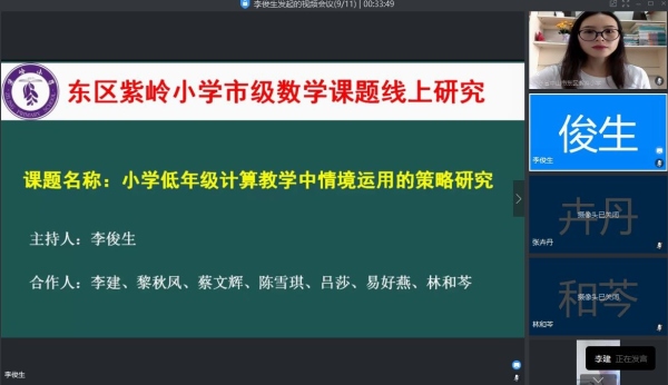 人間五月新翠成蔭,紫小教研熱火朝天。為推進(jìn)市級課題研究進(jìn)程,5月6日上午,東區(qū)紫嶺小學(xué)數(shù)學(xué)科組開展了線上課題研究會議,會議圍繞《小學(xué)低年級計算教學(xué)中情境運用的策略研究》課題展開,張卉丹主任、李建副主任、課題主持人李俊生老師和課題組成員參加了此次會議。