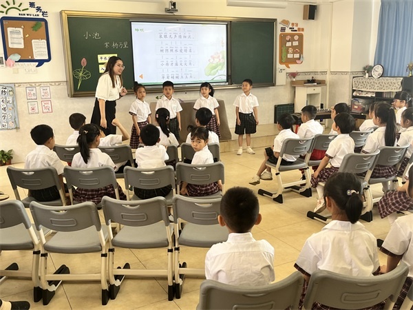 首先,調(diào)研組和語文科組的全體老師共同觀摩了一年級(jí)劉凱銀老師展示的課例《小池》。課上,劉老師運(yùn)用各種誦讀的方式,帶領(lǐng)學(xué)生感受古詩當(dāng)中的韻律之美,并通過圖文結(jié)合等方法感知古詩所描繪的夏日荷塘的和諧與情趣,讓學(xué)生多方位領(lǐng)略中華優(yōu)秀傳統(tǒng)文化吟誦的魅力。課堂上,劉老師還邀請(qǐng)了學(xué)校音樂老師為學(xué)生們進(jìn)行古箏伴奏,讓學(xué)生們?cè)谝魳分羞M(jìn)一步領(lǐng)略吟誦的美。課后,劉老師大方沉穩(wěn),有條不紊地說課,充分展示中山市實(shí)驗(yàn)小學(xué)教育集團(tuán)大豐小學(xué)青年教師的風(fēng)采。